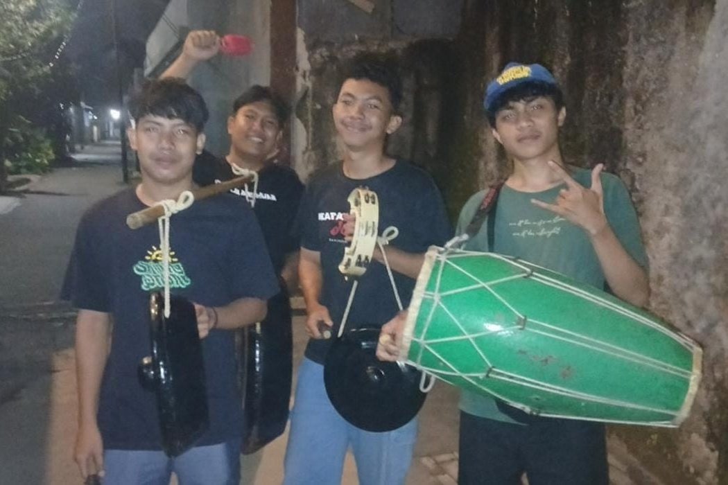 Mereka berkeliling kampung memainkan gong, kempul, dan kecrek sebagai penanda waktu makan sahur selama Ramadan.