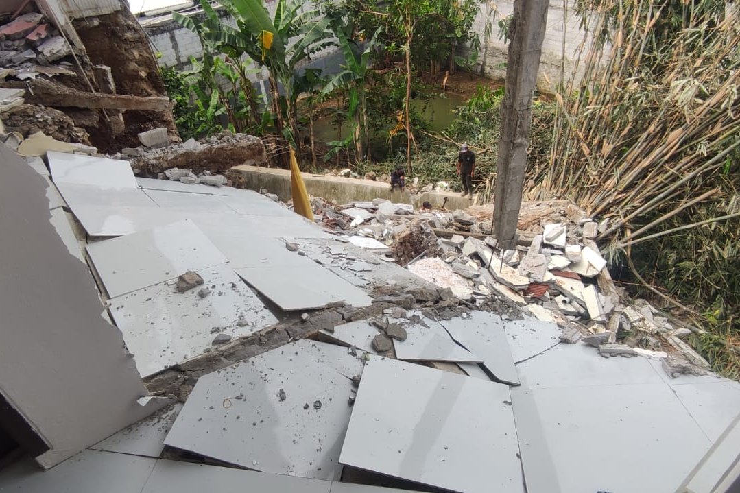 Kondisi itu membuat penopang bangunan tak mampu menahan beban, hingga menyeret bagian belakang rumah warga lain dan menutup saluran air di bawahnya.